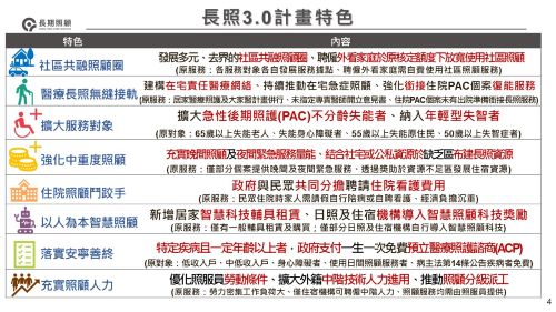 三、長照3.0計畫特色將致力於打造社區共融照顧圈,廣布基層社區據點及各類長照服務資源,多元管道支持社區發展,並使聘僱外籍看護家庭也能在核定額度內使用社區式照顧服務。同時,將強化醫療長照無縫接軌,建構在宅責任醫療網絡,以及急性後期照護(PAC)銜接長照復能服務。在服務對象方面,將擴大至不分年齡的PAC失能者及年輕型失智者,另強化中重度照顧,規劃充實晚間照顧及夜間緊急服務量能,並結合社宅或公私資源於缺乏區布建長照資源。未來亦將推動智慧照顧,新增居家智慧科技輔具租賃並獎勵機構導入智慧照顧科技。最後,為落實安寧善終,特定疾病且一定年齡以上者,政府將支付一生一次免費的預立醫療照護諮商費用。